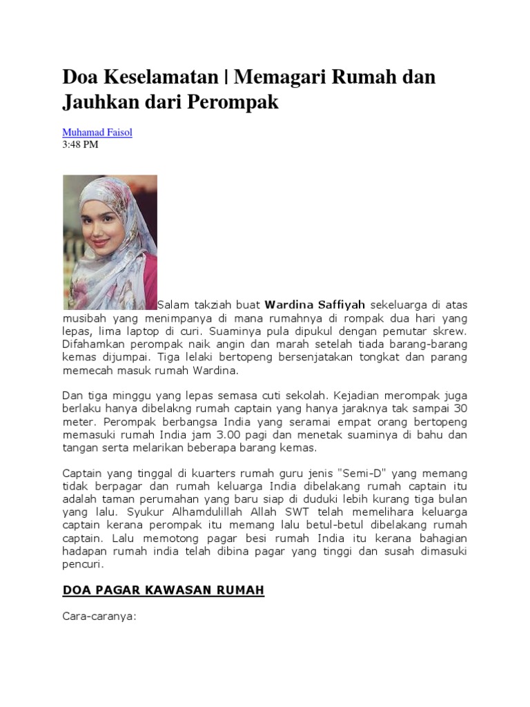 Tentunya tak ada seorang pun yang menginginkannya. Sebelum membelinya, yuk cari tahu berapa harga kawat duri tak dapat dipungkiri bahwa memasang kawat duri di atas tembok rumah sangatlah penting, mengingat tindak kejahatan berupa pencurian dan. Baiknya tetap melakukan usaha batin melalui doa agar rumah aman dari pencuri. Namun dengan segala hiruk pikuknya kehidupan dunia, tak ada yang dapat menyangka kepada siapa dan kapan musibah pencurian akan datang menghampiri. Dan anda jangan khawatir, dalam islam ada doa yang bisa dibaca agar rumah anda selamat dari maling dan gangguan jin saat ditinggal tidur pada malam hari. Doa pagar rumah dan diri mp3 & mp4. Di sinilah peranan solat sunat. Amalkan doa pagar rumah ini pencuri gerun takut nak masuk rumah kita ustaz kazim elias. Dzikir malam pelindung dari gangguan jin dan syetan coba dengarkan dan rasakan kedahsyatanya. Sudah terbukti bacaan untuk mengembalikan barang kita yang di curi orang. Agar selamat dan terhindar dari perampokan, pencurian, dan lain sebagainya saat bepergian, maka kita sangat dianjurkan untuk membaca doa berikut doa ini dibaca selepas keluar dari rumah dengan mengarahkan pandangannya ke arah langit. Ketika rumah anda telah dikunci dengan rapi, maka letakkan tapak tangan kanan anda ke pintu atau dinding rumah dan. Melihat manfaat pagar gaib maka banyak yang mencari amalan doa membuat pagar baik untuk memagari diri, rumah dan.