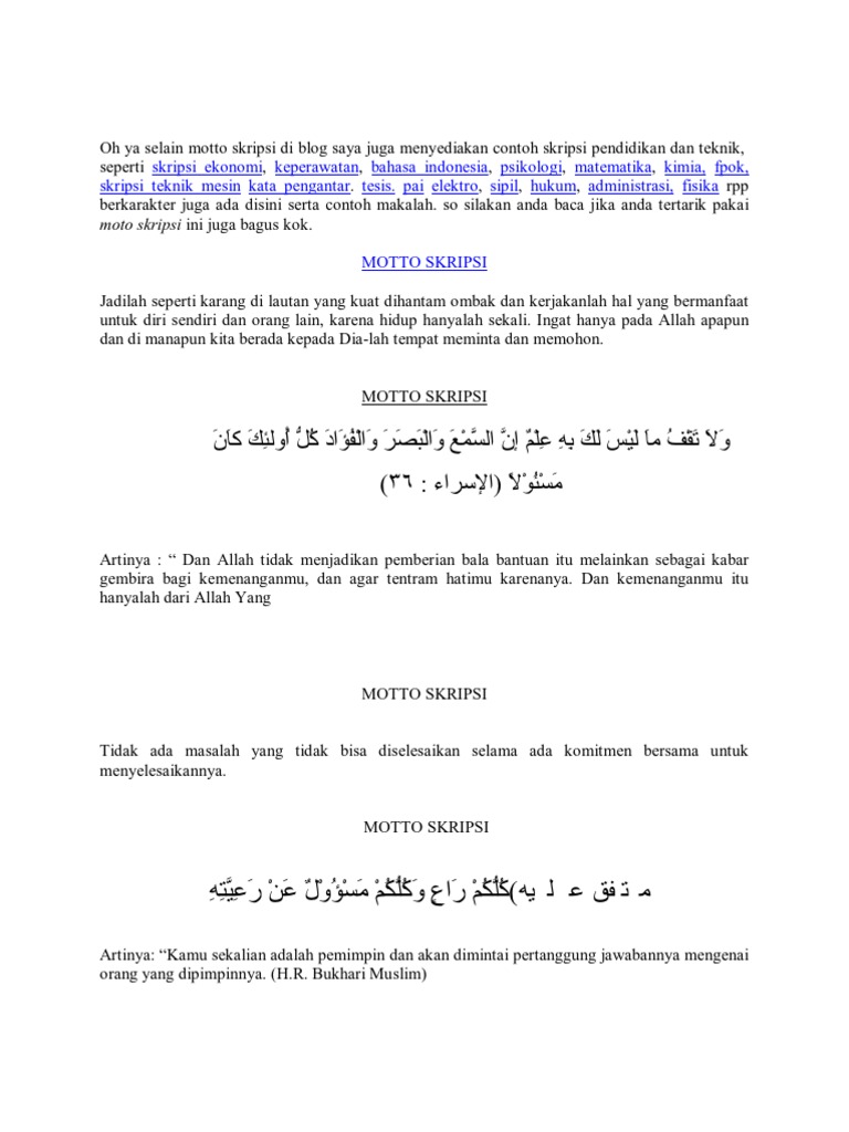 100 Motto Pendidikan Dan Ilmu Pengetahuan Dari Para Tokoh from cdn.kitapunya.net Jadilah dirimu sendiri, jadilah apapun. Motivasi berasal dari kata motif yang berarti dorongan atau rangsangan atau daya penggerak yang ada dalam diri seseorang. See full list on tripven.com Aug 22, 2020 · contoh motto skripsi terbaik penuh makna. Slogan merupakan frasa yang digunakan untuk konteks agama, ideologi, pengetahuan, organisasi, politik dan komersial, sebagai bentuk ekspresi dari sebuah gagasan dan ide untuk sebuah tujuan bersama. Berpikir mandiri dan kreatif, berorientasi tujuan. Landasan untuk kesuksesan masa depan. Slogan juga bisa disebut motto (tagline) atau semboyan yang di dalamnya mencakup kata kata yang padat, singkat, jelas dan inspiratif, sehingga banyak masyarakat bisa mudah mengingat dan percaya di mana tujuan bisa dicapai dengan penuh tekad dan semangat.